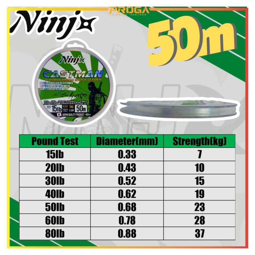 NINJ Castman Fluorocarbon Fishing Shock Leader Line 50M