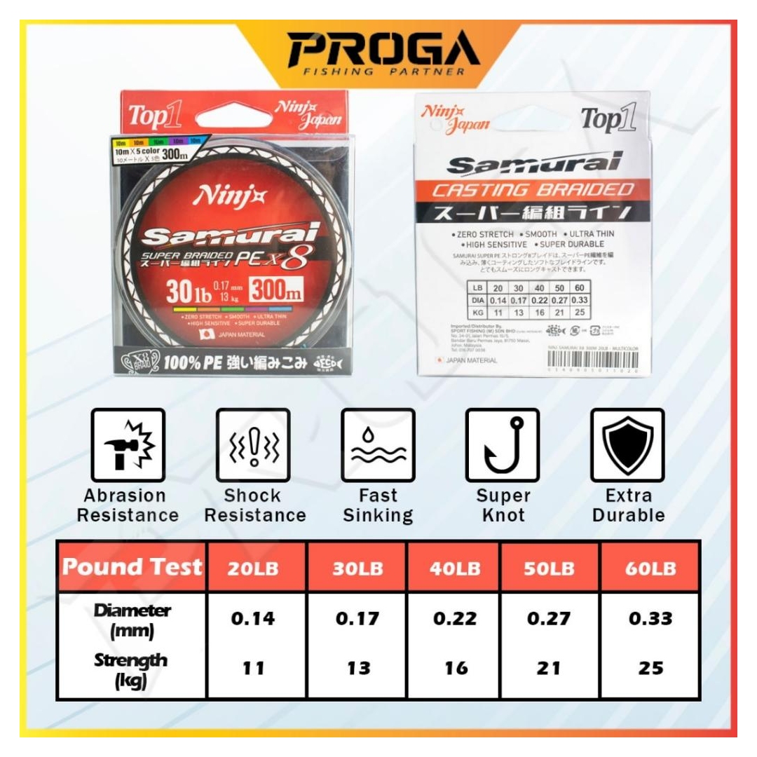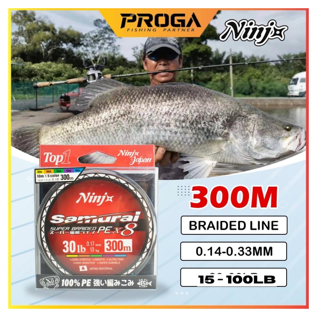 NINJA SAMURAI super braided PE X8 fishing line 300m – ZERO STRETCH – SMOOTH – ULTRA THIN – HIGH SENSITIVE – SUPER DURABLE LB 20 30 40 50 60 DIA (mm) 0.14 0.17 0.22 0.27 0.33 Test (KG) 11 13 16 21 25