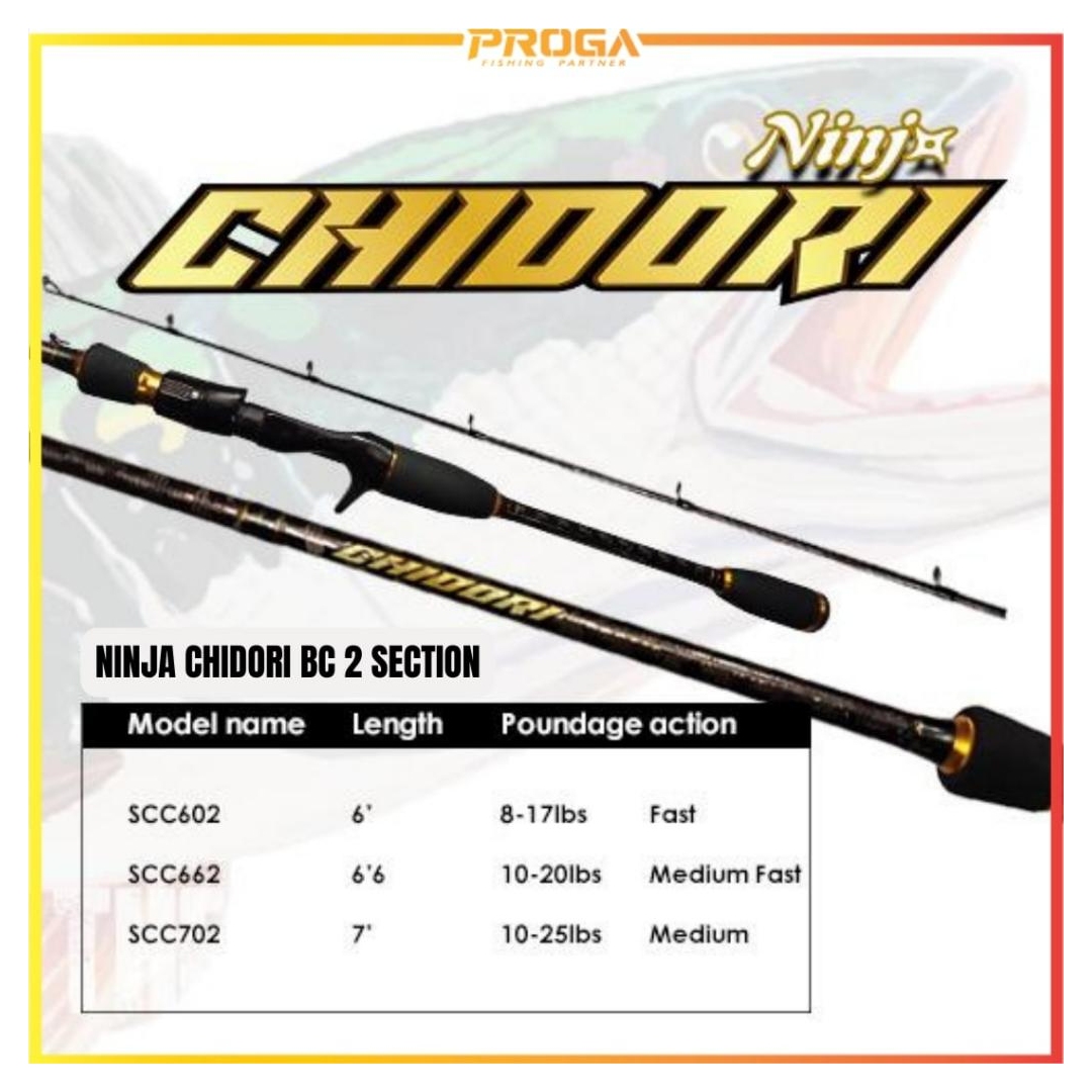 NINJ CHIDORI Baitcasting Fishing Rod Section: 2pcs Model: SCC602 Length: 6’0″ Line: 8-17LB Lure Wt: 7-21g SCC662 Length: 6’6″ Line: 10-20LB Lure Wt: 7-28g SCC702 Length: 7’0″ Line: 10-25LB Lure Wt: 7-30g