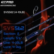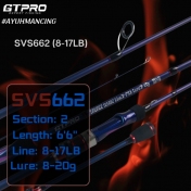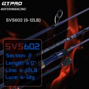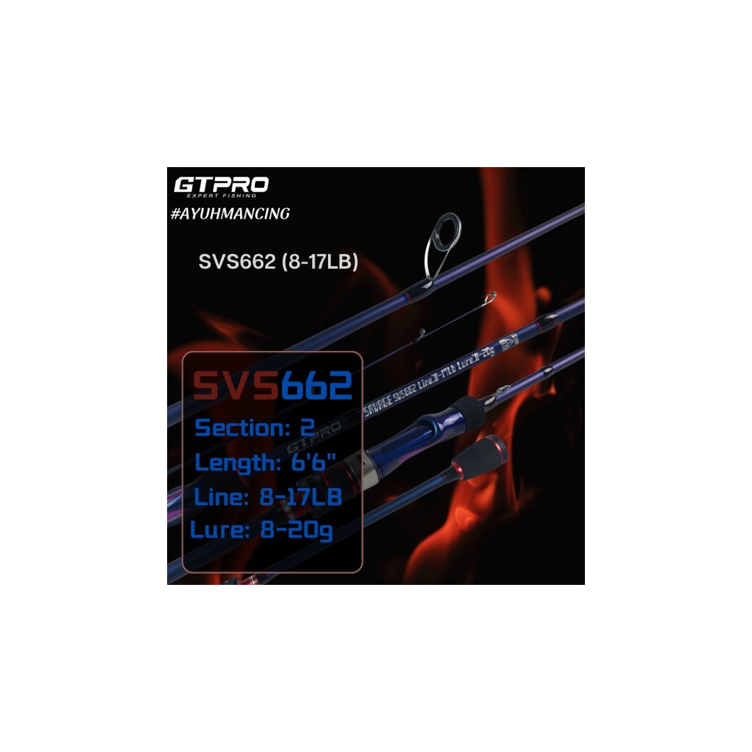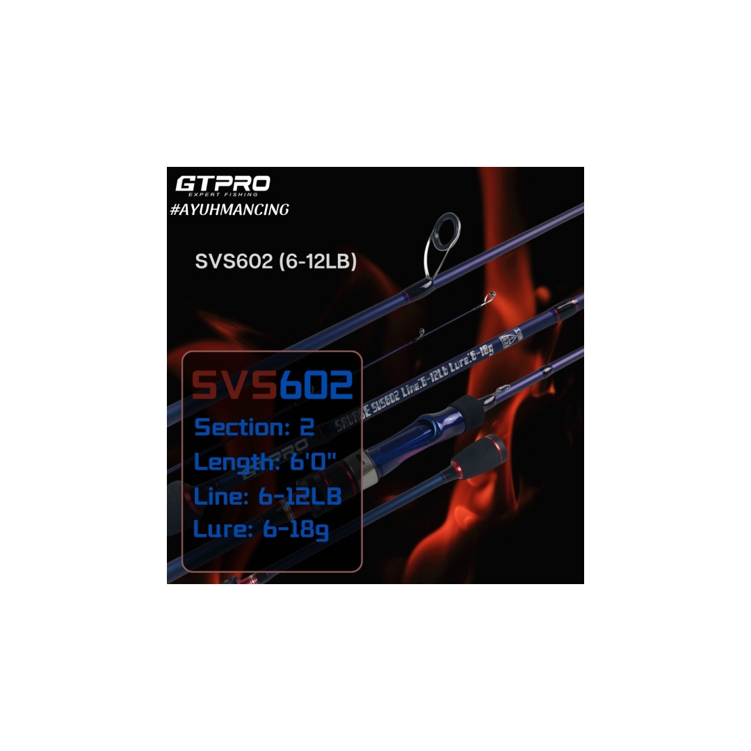 GTPRO SAVAGE Spinning Fishing Rod Section: 2pcs Model: SVS562 Length: 5’6″ Line: 4-10LB Lure Wt: 4-16g SVS602 Length: 6’0″ Line: 6-12LB Lure Wt: 6-18g SVS662 Length: 6’6″ Line: 8-17LB Lure Wt: 8-20g