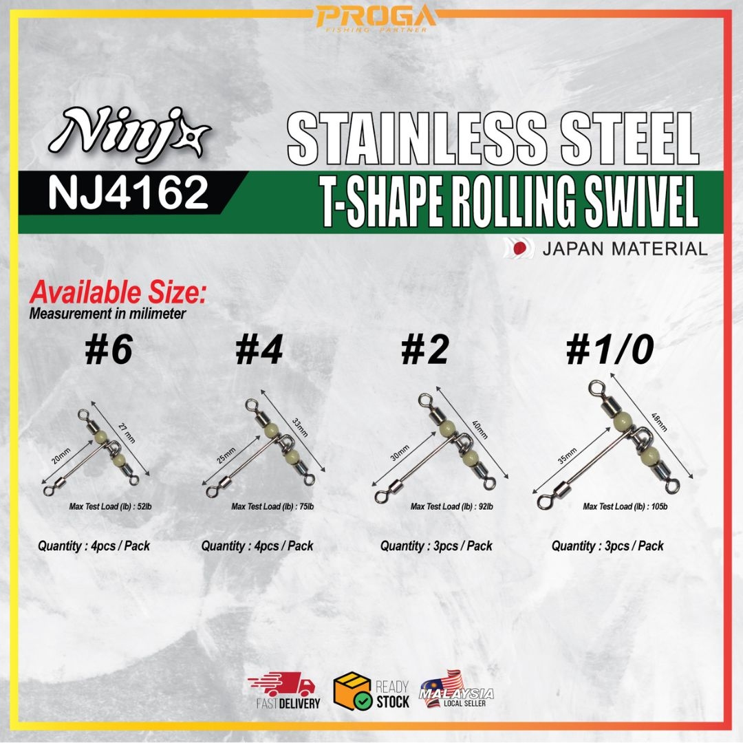 NINJ+ NJ4162 T-SHAPE ROLLING SWIVEL #2-#1/0 HIGH PERFORMANCE & QUALITY =SIZE= =TEST(LB)= =QTY= #6 52LB 1 PKT 4 PCS #4 75LB 1 PKT 4 PCS #2 92LB 1 PKT 3 PCS #1/0 108LB 1 PKT 3 PCS