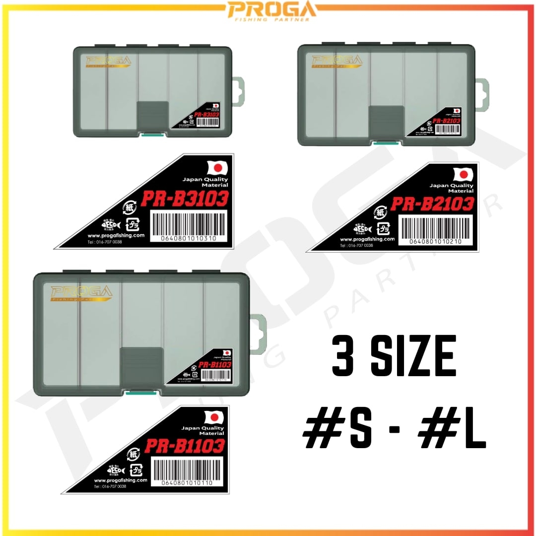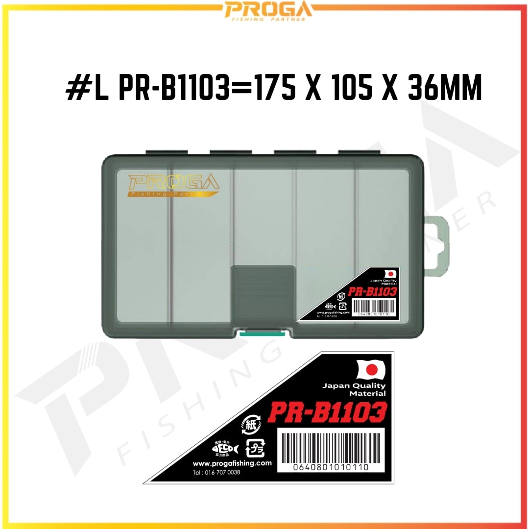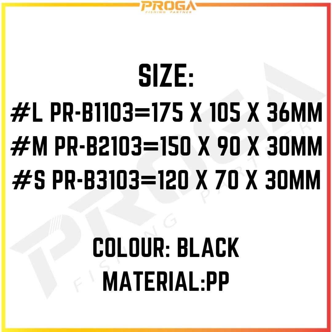 PROGA PR-B1103-3103 TACKLE CASE {BLACK} SIZE: #L PR-B1103=175 X 105 X 36MM #M PR-B2103=150 X 90 X 30MM #S PR-B3103=120 X 70 X 30MM STRUCTURE: FIXED BAFFLE X 4 COLOUR ; BLACK MATERIAL:PP